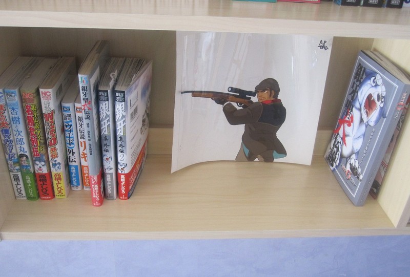 Keskihylly jossa suomimangat 1-5, Cross & Riki figut, Pachinko official guide book ja Orionin 1-14. 14 näkyy huonosti eikä mahtunut kuvaan. ^^ Purppura obi kuitenkin yrittää näkyä.